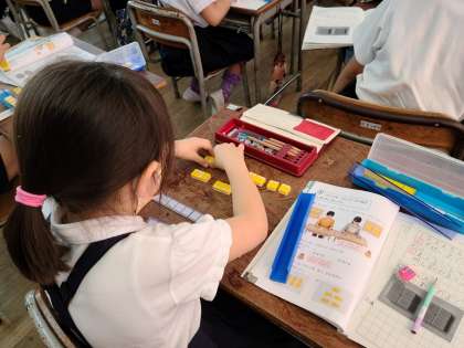 口と耳とブロックの操作活動と、さまざまな感覚を働かせながら理解することが、低学年では大切です。