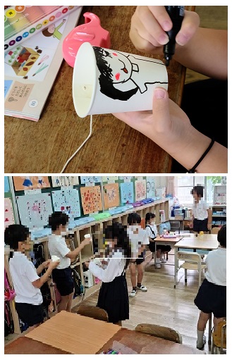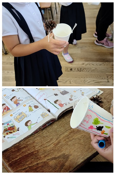 紙コップには思い思いの絵を描いてお気に入りのおもちゃにしていました。