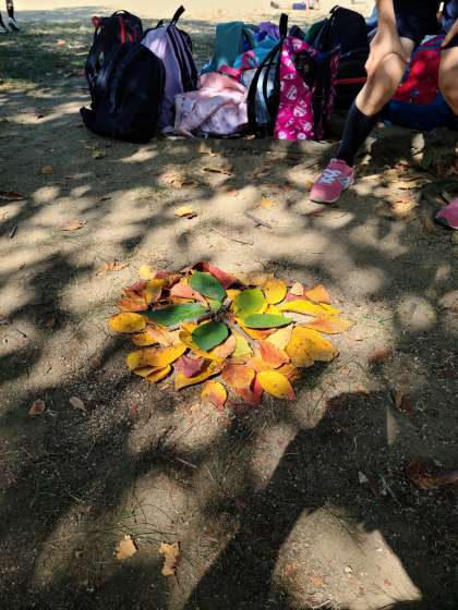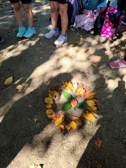 落ち葉で花の芸術 落ち葉集めでフカフカ落ち葉のお風呂?