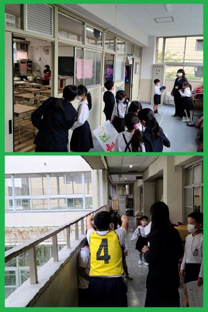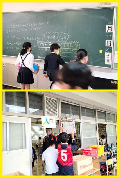 6時間目、2年生から6年生のファミリー班のメンバーが、それぞれの活動場所に集まりました。明日(10月20日)の「めいじなかよしまつり」本番に向けての最後の準備活動です。