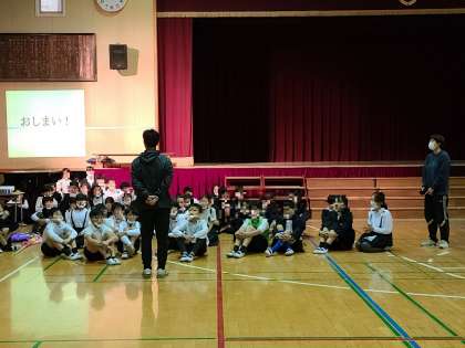 内容は当日までのお楽しみで、ここでは、リハーサル後に観覧していた5年生の担任の先生からお話をいただいている6年生の様子を画像として紹介しています。