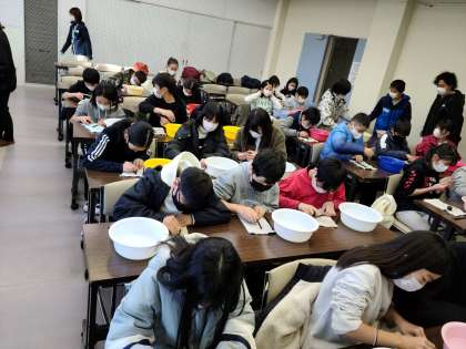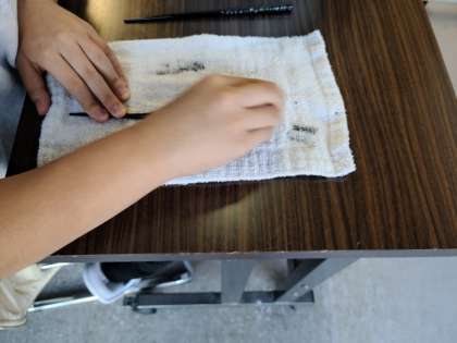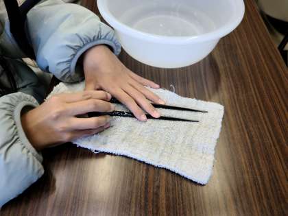 まずは若狭塗り箸づくりに取り組みました。砥石で削って貝殻の装飾を浮き立たせていきます。