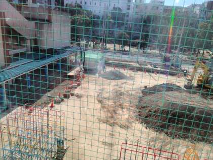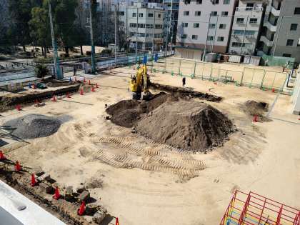 ショベルカーが掘っている溝にあたる部分が、工事中に運動場の使用可能エリアや体育館へ向かう子どもたちの仮設通路が設置される予定の場所となります。赤いコーンが列になって並んでいる部分です。