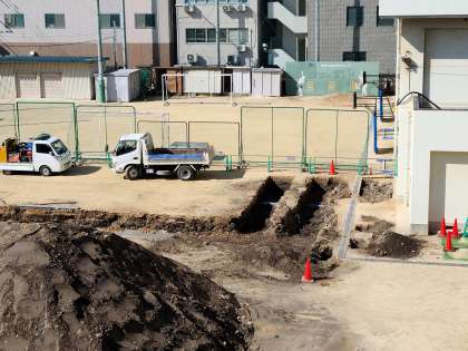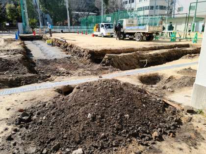 仮設通路の位置がさらにはっきりとしてきました。通路になる予定の部分に掘られた溝がさらにはっきりとしてきました。