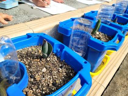 1年1組がチューリップの観察をしていました。秋に1年生が植えたチューリップの球根が、春の訪れに誘われて芽を伸ばしています。