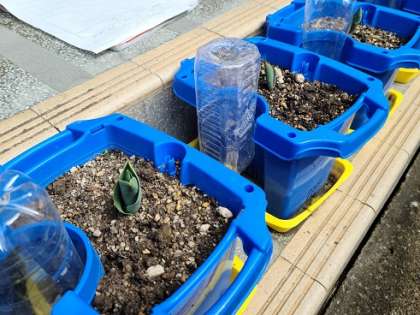 「ぐんぐん伸びてほしいな」「何色の花が咲くのかな」チューリップの芽と対話しながら観察を続ける1年生でした。