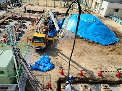 今日は基礎の枠組みに生コンクリートが注入されています。働く車「コンクリートミキサー車」が活躍中です。