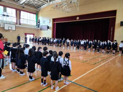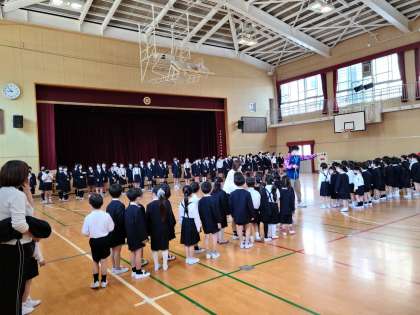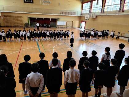 密を避けるため、2〜6年生を代表して6年生が講堂で待ち受け、1年生と対面しました。2年生〜5年生は、教室からTeamsを活用してのリモート参加としました。