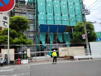 ピロティのある校舎がいよいよ足場に覆われ始めました。