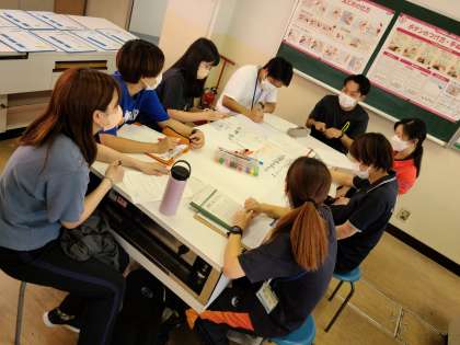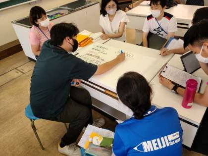 中央の紙に意見を書き込みながら、先生たちも協働しながらの学び合いです。