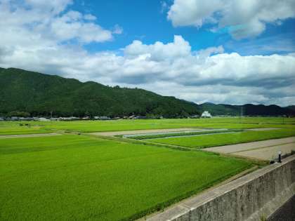 水田の鮮やかな緑と山々の深い緑が心を和ませてくれます。