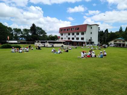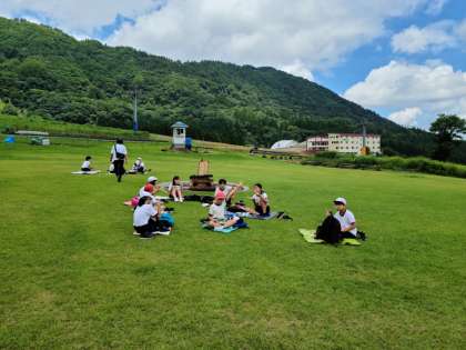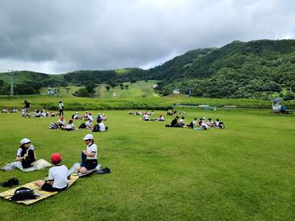 宿舎前の草地での昼食です。宿舎で用意していただいた弁当を活動班で食べました。