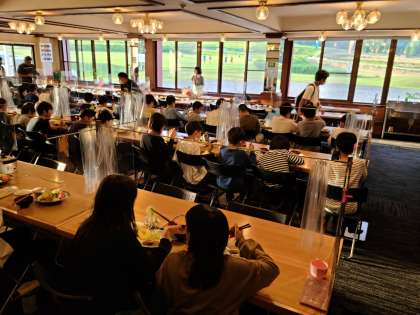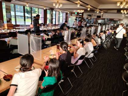 ハチ高原での半日でお腹をすかせ、夜のキャンプファイヤーに備えてエネルギー補給です。