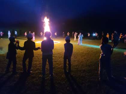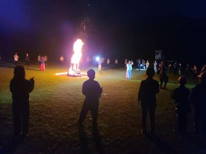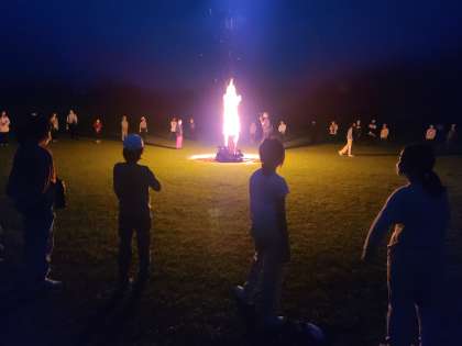 午後7時40分、キャンプファイヤーが始まりました。ダンスやゲームなどキャンプファイヤー係のリードで楽しみました。