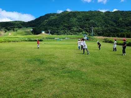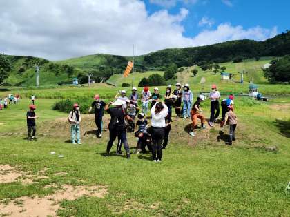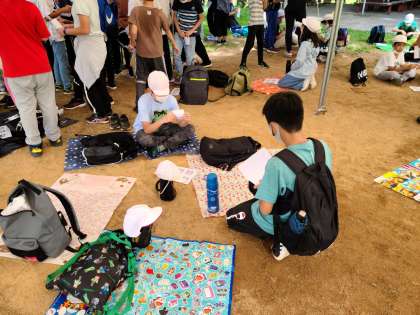フィールドオリエンテーリングから戻ってきた子どもたちは、飛行リング作りに取り組み、広い芝生で遊び始めました。