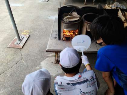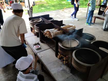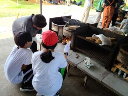 かまどの係は、まきに点火し、火の加減を調節しながら、煙に悩まされつつ頑張っていました。
