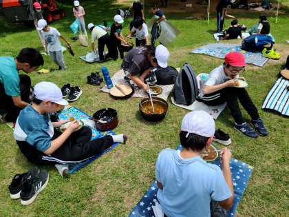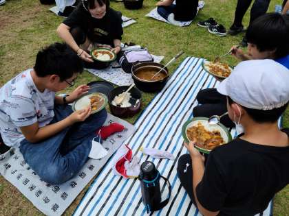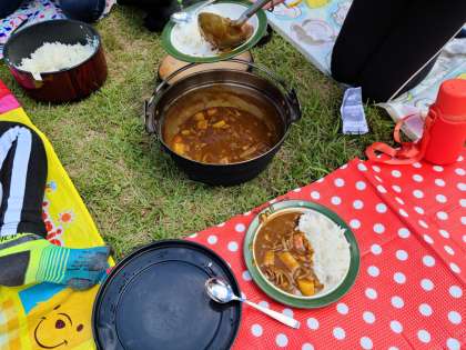 カレーができあがりました。ご飯は宿舎の食堂で炊いたご飯をいただき、自分たちで作ったカレーをいただきました。
