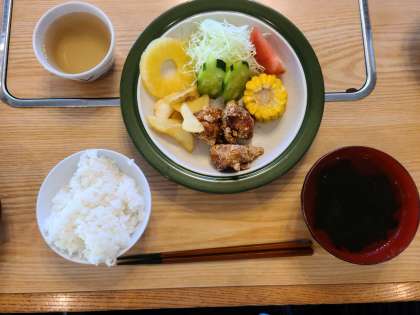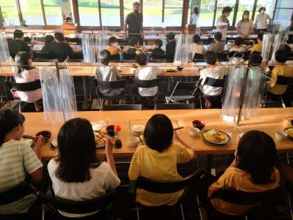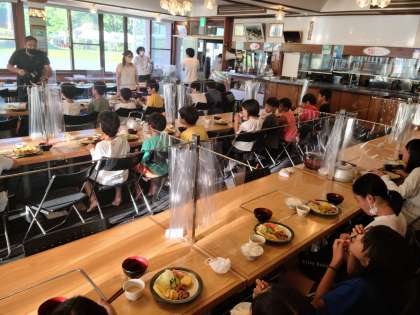 林間学習最後の夕食です。メインのおかずは、子どもたちに絶大な人気の鶏の唐揚げです。美味しくサッサといただく5年生でした。