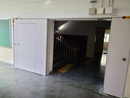 中央校舎と北校舎の階段室には、防火扉を設置していっています。来年度にかけて少しずつ進めていきます。