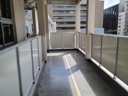 エレベーター棟への渡り廊下部分では、耐震性を高めるために、コンクリートの側壁を撤去し、軽量の柵に取り替えられました。