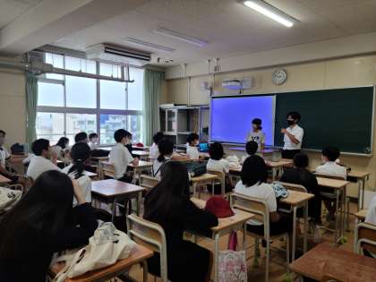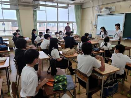 中学1年生と2年生の代表生徒による中学校生活の紹介が、質問形式で行われました。