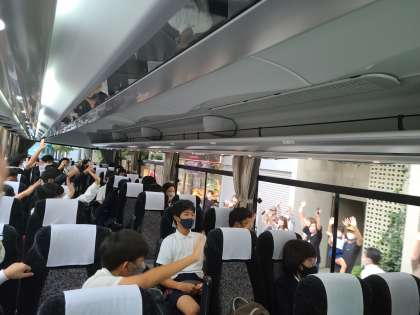 修学旅行への出発です。お見送りの家の人、学校の教職員、ありがとうございます。