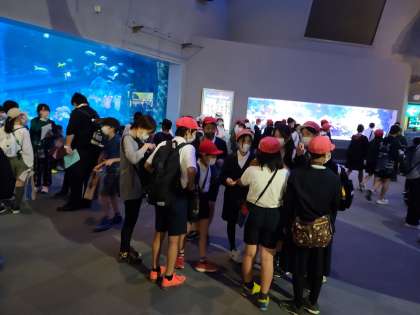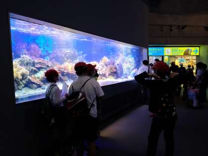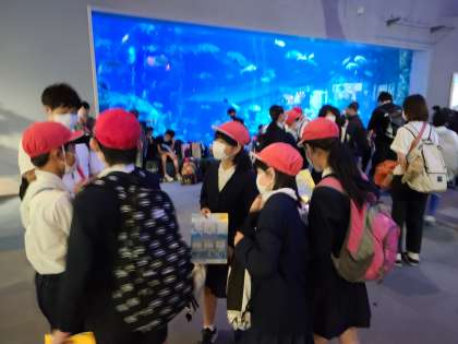 PM2:38 鳥羽水族館のエントランスホールです。これから活動班ごとに館内を見学に、おみやげ物購入にと巡ります。