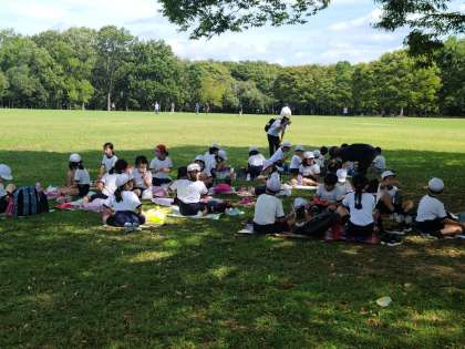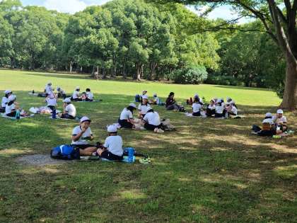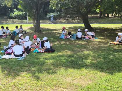 クラスごとに木陰を見つけて いただきます。