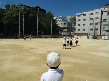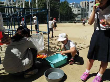 今日は、運動場でシャボン玉を作って飛ばしました。