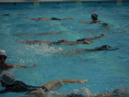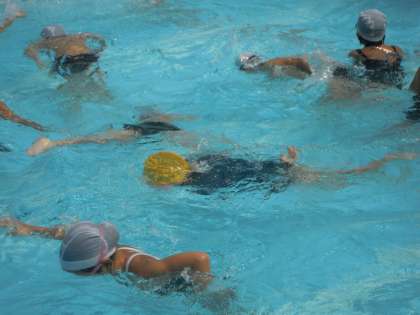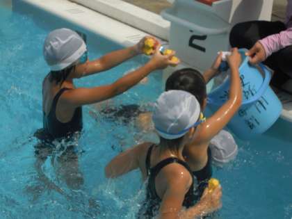 水泳最終日は、プールに沈めた「ゴムの宝」を拾う「宝探し」をしました。みんな水を怖がらずに潜れるようになったね。