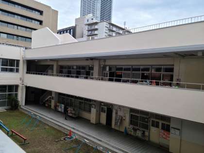 中央校舎北側の外壁補修や塗装が終了し、すっきりした外観となっています。残るは南側の壁と南校舎(1年生の教室やプールのある校舎)の外壁、屋上補修工事です。