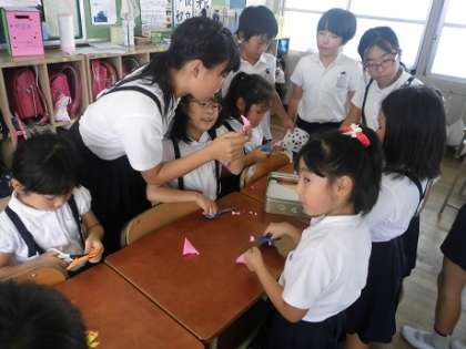 6年生が1年生を教室に招いて「折り紙教室」を開きました。休み時間に6年生の教室に来た1年生を6年生が折り紙を教えます。6年生にやさしく教えてもらって、1年生も大満足の様子でした。