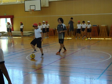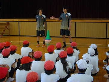 フットサルチームの「シュライカー大阪」の方々に来ていただき、講堂でフットサルについて教えていただきました。楽しくみんなでアップした後、ボールの扱い方の基本となる練習をしました。最後は、選手との試合をしました。とても上手なプレーを目の前で見ることができ、よい経験になりました。