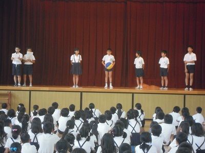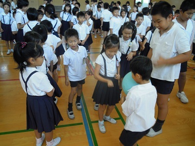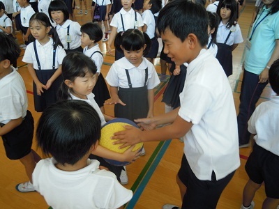 リクリエーション委員会の企画・進行でたてわり班を使ったゲームをしました。じゃんけんをして勝ったら次の人へボールを送り、負けたら前の人にボールを戻すというゲームです。委員会の人が見本も見せてくれました。6年生が低学年にやさしく声かけしていましたよ。