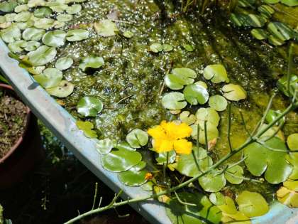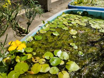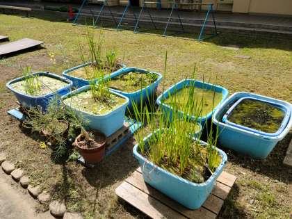 このアサザは、以前に南河内にて、自生していた株の一部を採取し、明治小学校のミニビオトープで生育させてきたものです。