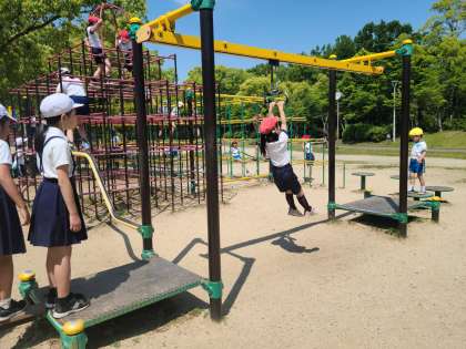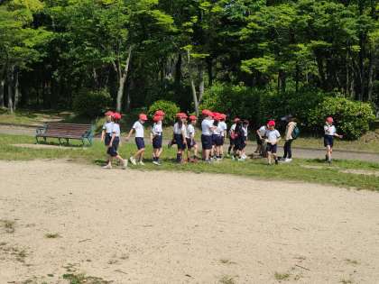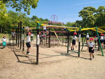 遊具遊びをおえた出発前にも、給水の列ができていました。