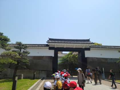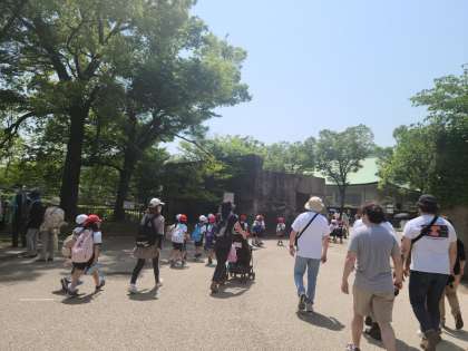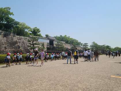 大阪城公園を訪れている外国人観光客の皆さんとともに、公園内を歩いています。大阪城天守閣の真下をめざします。