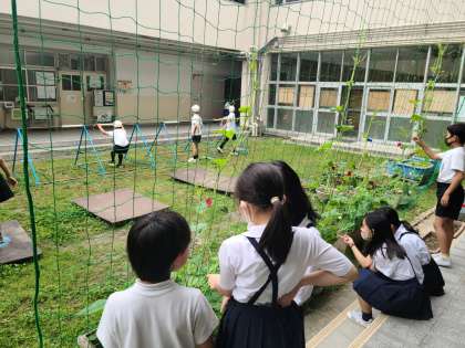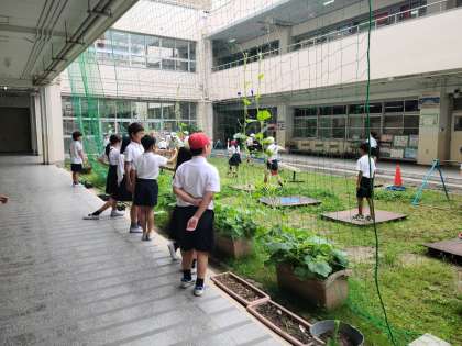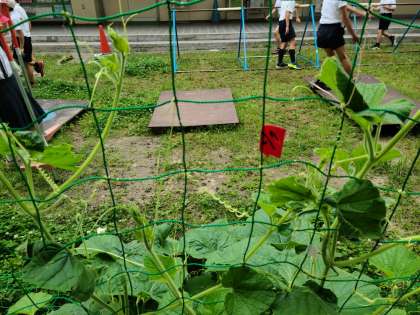 休み時間、理科室前の緑のカーテンに4年2組の子どもたちが集まっていました。理科の学習前に、緑のカーテンで成長中のヘチマやヒョウタンの成長ぶりに興味津々でした。