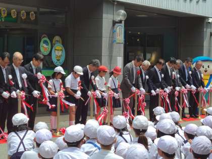 セレモニーでは、テープカットが行われ、明治小学校からも代表児童2名が参加しました。