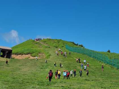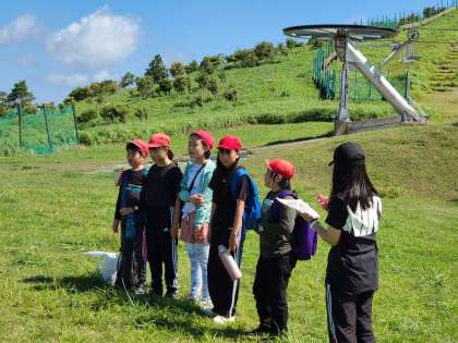 山頂手前のポイントでは、明治小学校の校歌をグループのみんなで声を合わせて歌うミッションがありました。