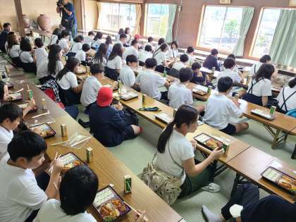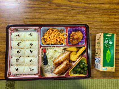 昼食は用意していただいたお弁当です。トンカツに唐揚げにと、子どもたちにとってボリュームのあるお弁当でした。