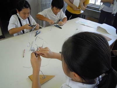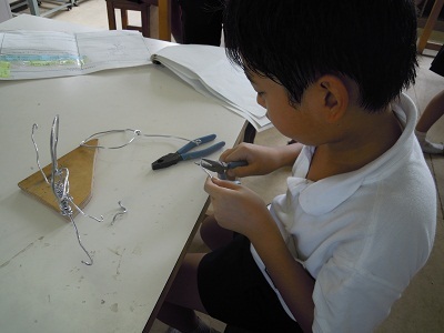アルミ針金を使って、人物のある瞬間の動きを表そうという学習に取り組みました。使い慣れないペンチなどを使ってそれぞれの工夫をしました。