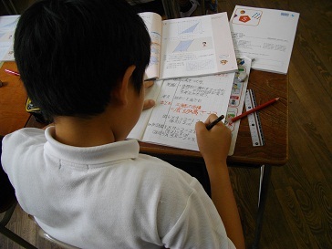 三角形の面積の求め方を学習しています。平行四辺形の面積の求め方を手がかりにして、三角形の面積の公式を導き出します。