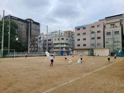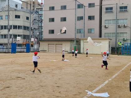 1月22日(月)の3時間目、1年2組が、全員で手作りのたこを上げて楽しんでいました。