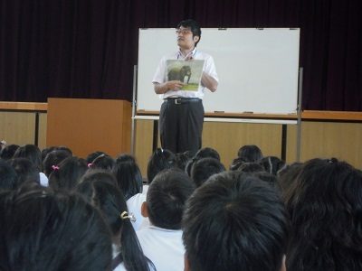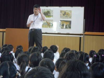 ゾウの鼻はなぜ長いか。キリンの首はなぜ長いか。そして、ゾウとキリンがいっしょにいるわけを考えさせました。互いを支え合う関係だということを知らせ、友だち関係についても考えようというメッセージでした。