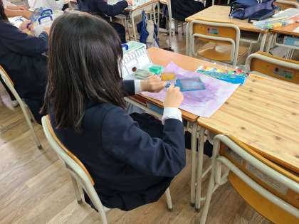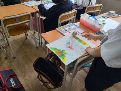 4年2組では、絵の具による様々な技法を使いながら、自分のイメージした模様を表現する学習に取り組んでいました。