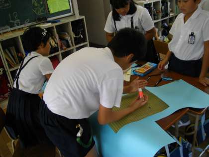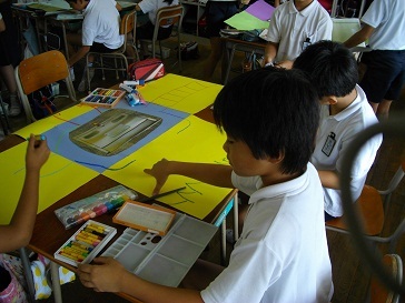 先週に引き続き、分校との交流学習では、学校にあるものの一部から想像して生き物に見立てて作品にします。班で協力して作っています。
