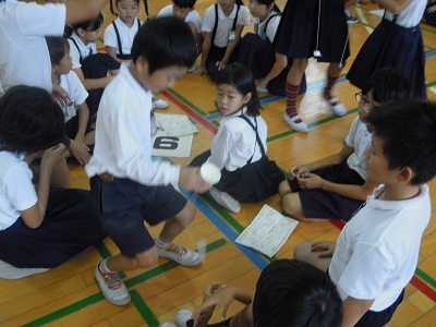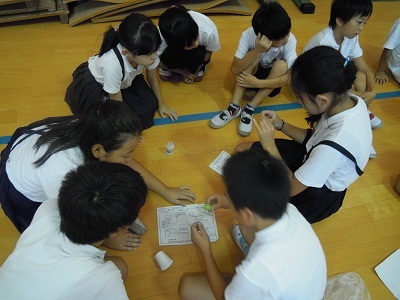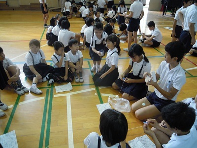 今日はたてわり班でヨーグルト容器やビー玉を使ってけん玉作りをしました。リーダーの6年生の指示でみんなで協力して作り、低学年を中心に楽しく遊びました。