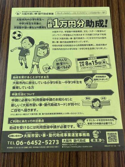 大阪市では、学習塾や家庭教師、文化・スポーツ教室など(オンライン学習塾などを含みます)で月額1万円まで利用できる「大阪市習い事・塾代助成カード」を交付する大阪市習い事・塾代助成事業を行っています。