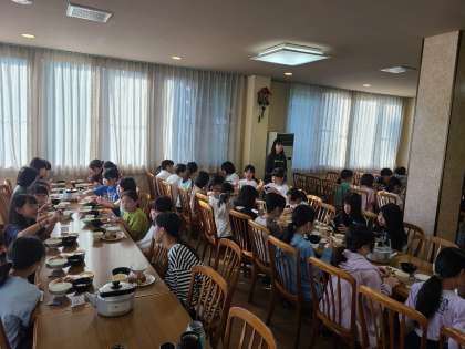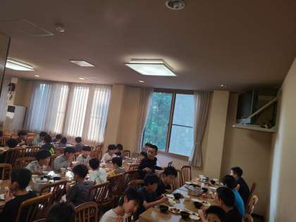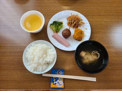 朝食です。1日のパワーをつけるため、「いただきます」のあいさつとともにおいしくいただきました。